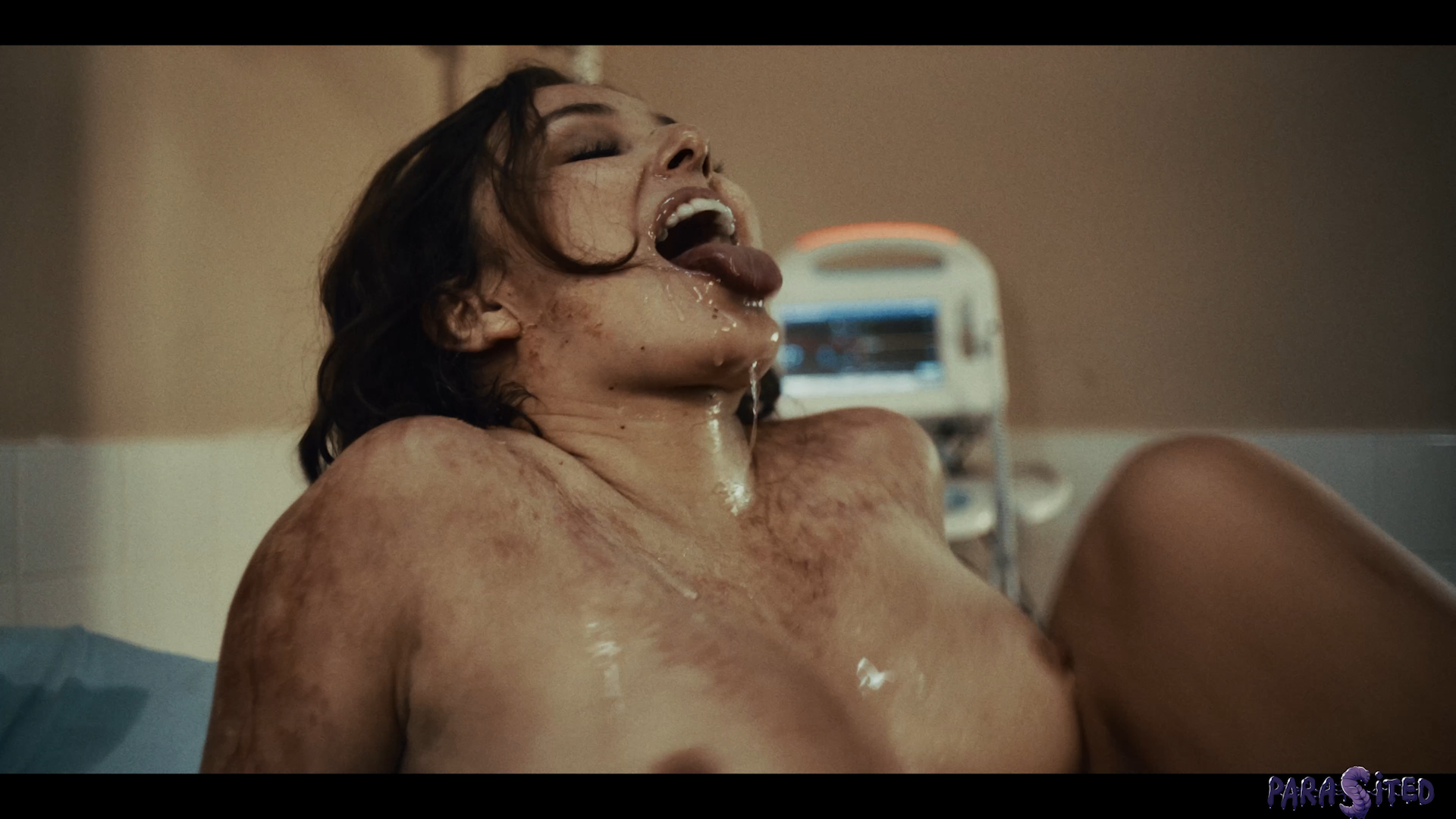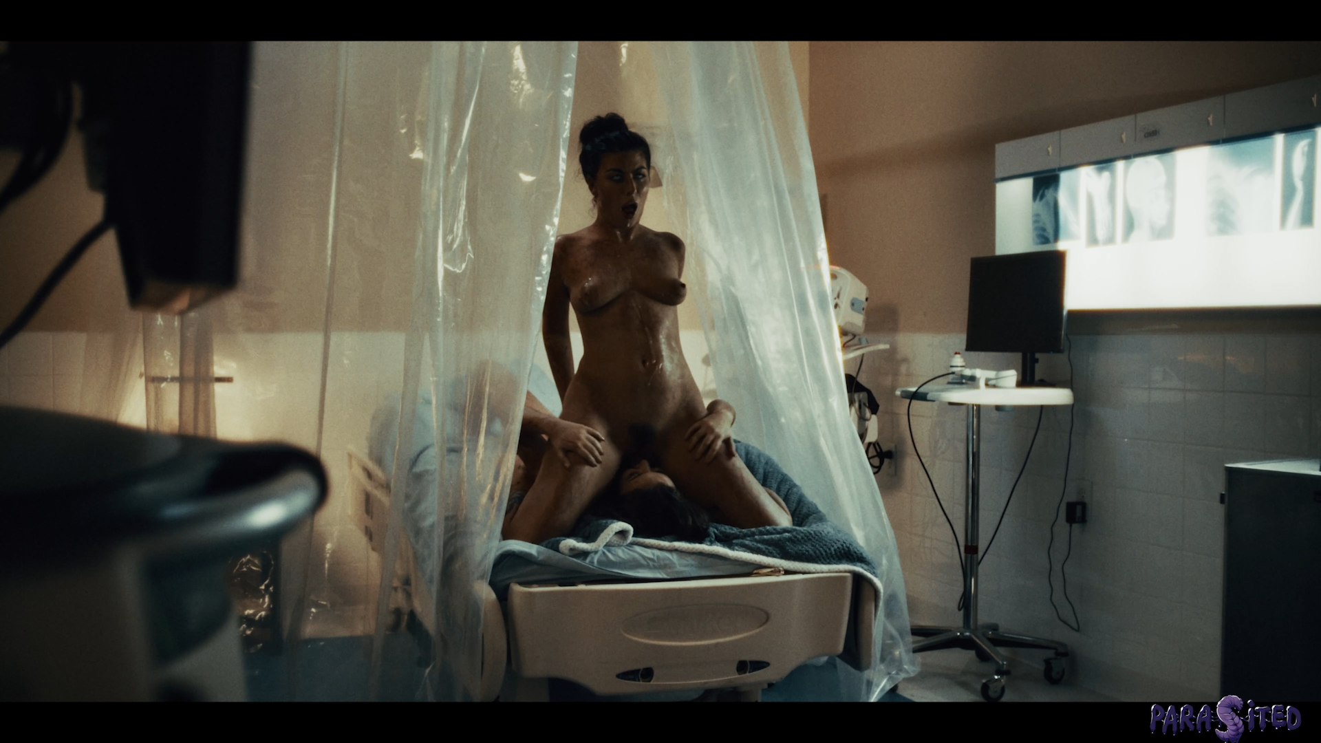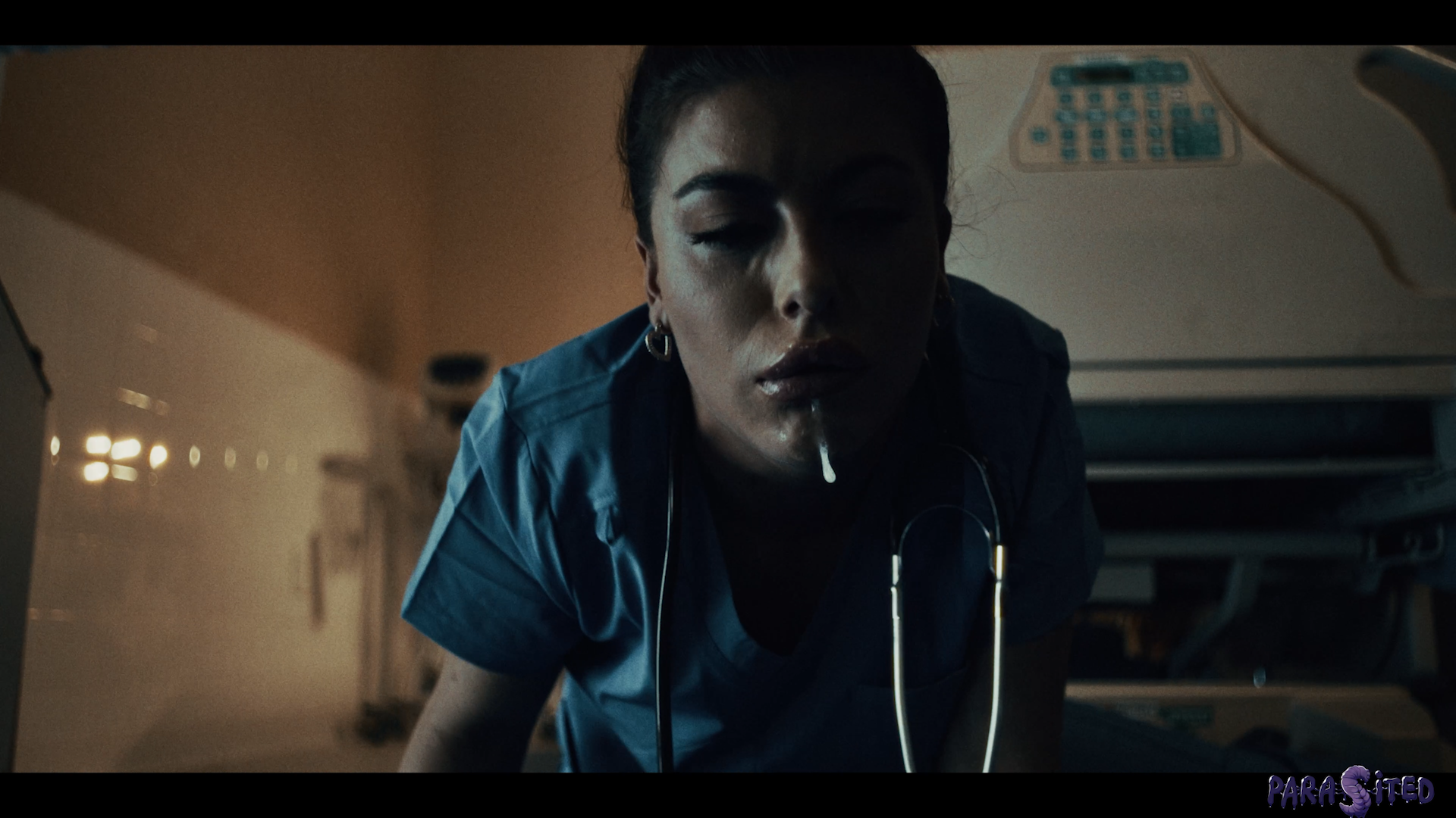 Susan (Leana Lovings) is recovering in hospital from her injuries, leaving the poor woman bedridden. She expresses her concerns with her nurse (Gal Ritchie) about strange noises she’s hearing in the night. The nurse tries to comfort Susan, listening to her worries before supplying her with medication. As she attempts to grab Susan’s medicine, the nurse witnesses something horrifying.  A monstrous parasite.